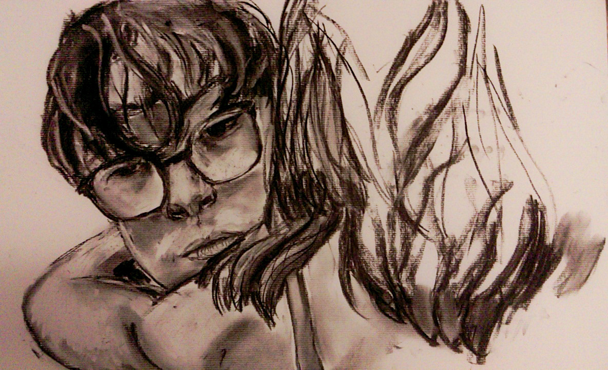 Charcoal piece of Sam and Suzy hugging in Wes Anderson's "Moonrise Kingdom"